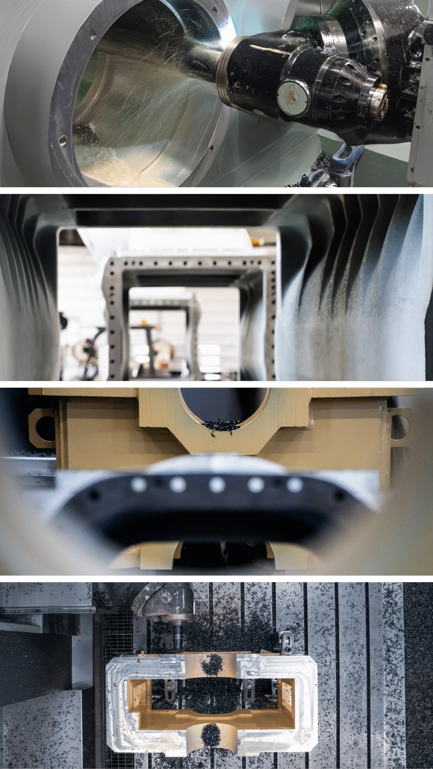 - 6-axis CNC milling machines O.M.V. PARPAS, each with impressive dimensions (8000x3125x1400 mm) and rotary tables of different sizes (2500×2000 mm and 2000×2000 mm) for handling large and complex workpieces, featuring a translation axis of 1,500 mm and a head with 0.001° precision.